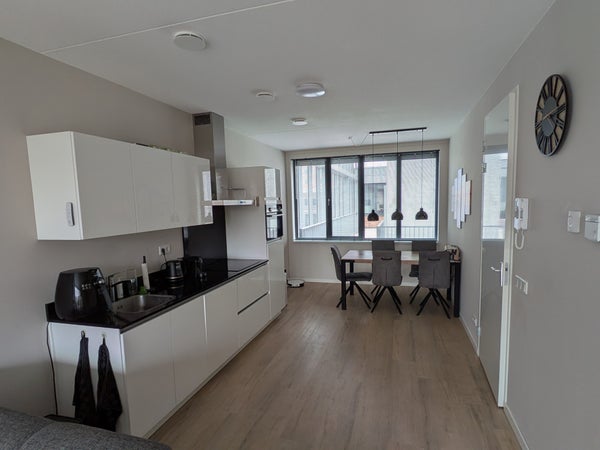 - Woonkamer met open keuken voorzien van diverse inbouwapparatuur waaronder koelkast, inductiekookplaat, combimagnetron, vaatwasser en recirculatieafzuigkap;