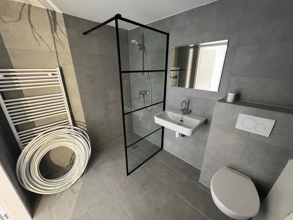 De badkamer is netjes afgewerkt met hangend toilet en inloopdouche met zwarte stalen douche wand. Een bad meubel met spiegel. In de badkamer bevindt zich tevens de aansluiting voor de wasmachine/droger. Je kunt er direct in.