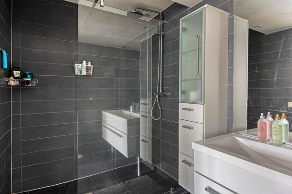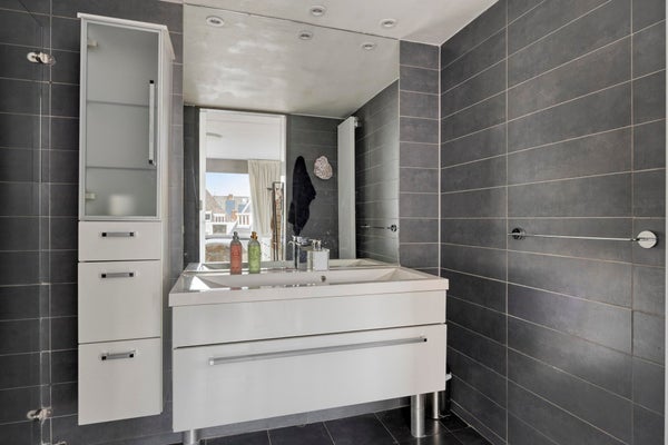 Via de woonkamer bereik je de hoofdslaapkamer, uitgerust met een tweepersoonsbed en kledingkast. Vanuit deze kamer kom je in de ruime badkamer met brede wastafel en inloopdouche.