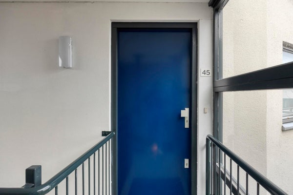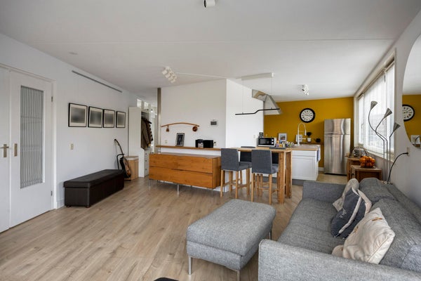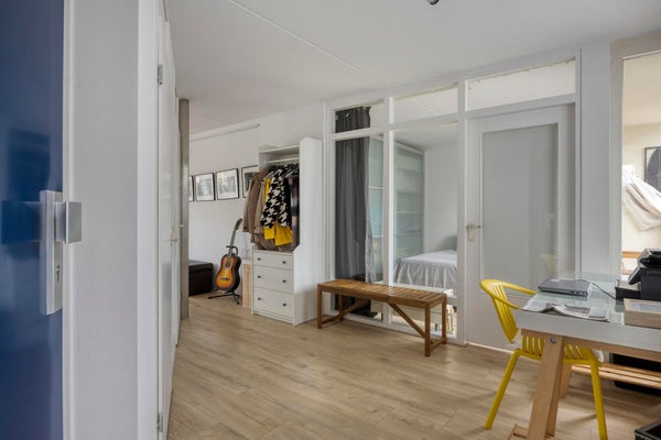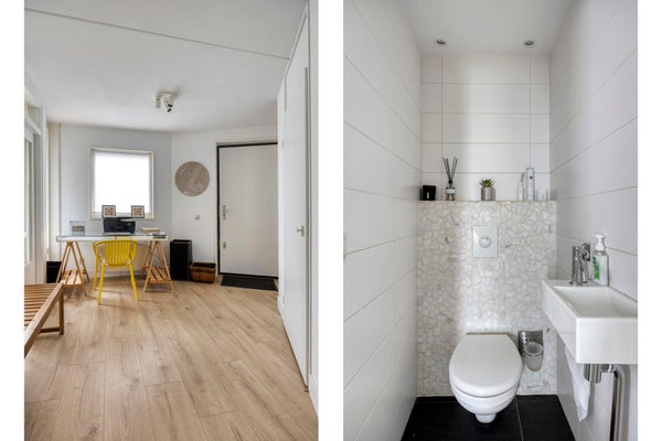 Je komt binnen in de lichte hal, waar tevens een werkplek is gecreëerd. Vanuit hier bereik je het separate toilet, de wasruimte, de keuken, één van de twee slaapkamers en de woonkamer.