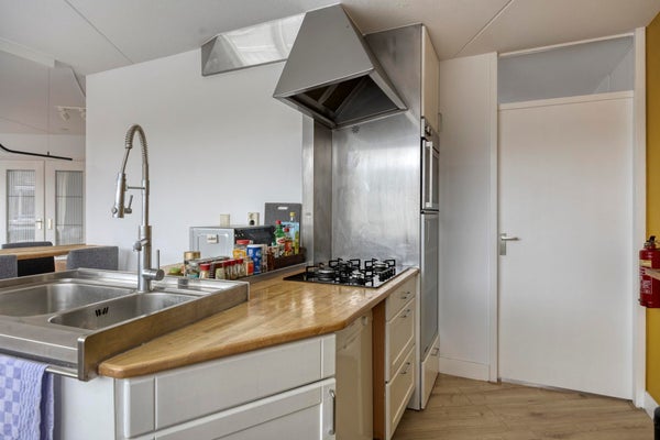 Keuken met diverse inbouwapparatuur, waaronder een combi-oven, vaatwasser, koel-vriescombinatie en 4-pits gaskookplaat.