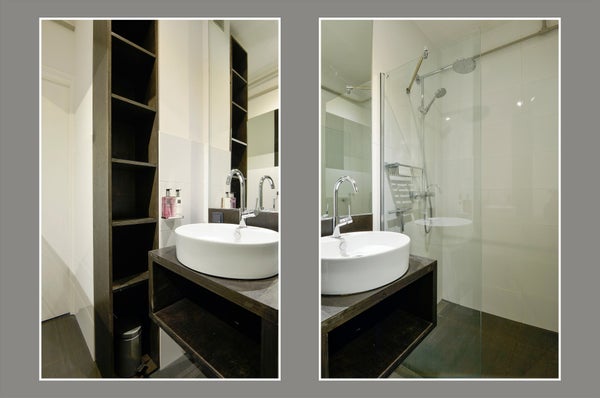 De badkamer is voorzien van een inloopdouche en wastafel met kastje.