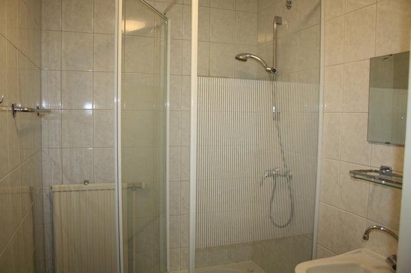Betegelde badkamer (circa 3 m2) met douche en wastafel.