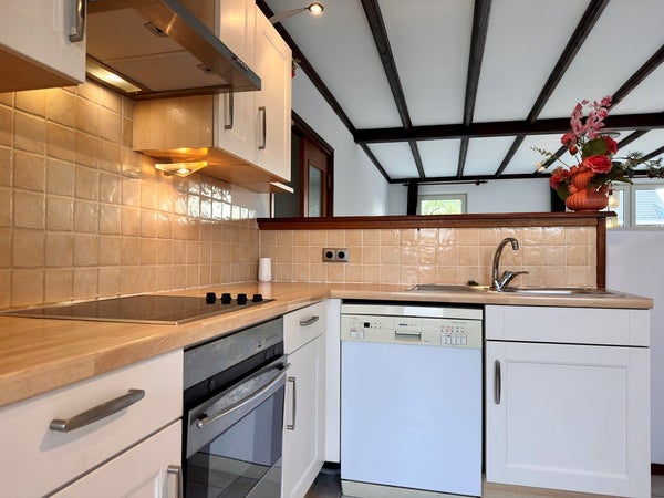 De keuken biedt toegang tot een ruim dakterras. De keukenopstelling is voorzien van een keramische kookplaat, inbouw afzuigkap, spoelbak, vaatwasser en koelkast. De badkamer is voorzien van een inloopdouche, toilet en ruim opgezet wastafelmeubel.
