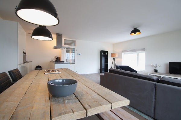Eerste verdieping: Entree in de hal van het appartement, vanuit waar de diverse kamers te betreden zijn. Aan het einde van de hal is de woonkamer te bereiken, een heerlijk lichte ruimte wegens de grote raampartijen en de toegang tot het balkon aan de voorzijde van het complex. De open keuken is modern en uitgevoerd in neutrale kleurstelling. Het beschikt over allerhande inbouwapparatuur, te weten; koel-/vriescombinatie, combi-oven, vaatwasser en gaskookplaat met afzuigkap.