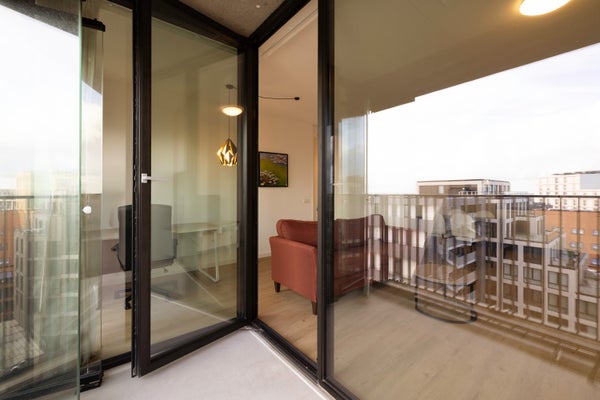 De ruime woonkamer wordt overspoeld met natuurlijk licht dankzij de vloer-tot-plafondramen en is elegant ingericht met eigentijdse meubels in een lichte, frisse stijl. Beide slaapkamers zijn royaal van formaat en voorzien van comfortabele bedden—waarvan één momenteel is ingericht als thuiskantoor voor optimale flexibiliteit.