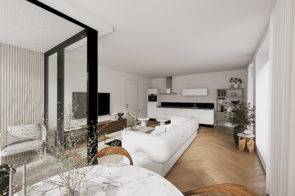 De woonkamer is voorzien van grote raampartijen. Deze zorgen voor een overvloed aan natuurlijk licht en bieden uitzicht op de groene omgeving. De open indeling maakt het een ideale ruimte voor ontspanning, familieavonden of gezellige diners met vrienden. De openkeuken staat in verbinding met de woonkamer. Deze is voorzien van de nieuwste apparatuur en biedt voldoende ruimte om uitgebreid te koken. Vanuit de woonkamer heeft u toegang tot de loggia waar de zon heerlijk op schijnt.