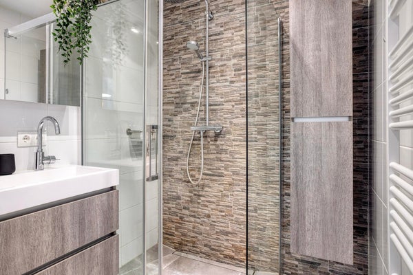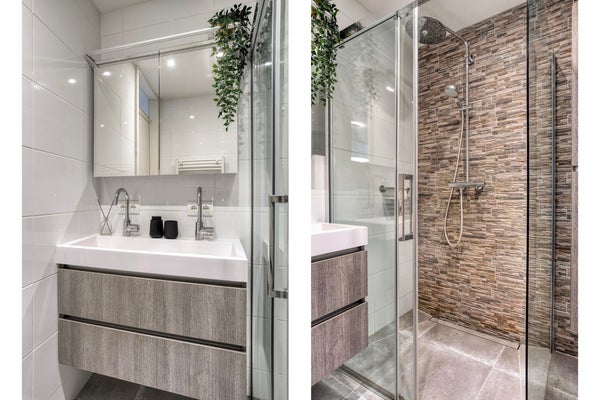 De hoogwaardig afgewerkte badkamer is slim ingedeeld en voorzien van alle gemakken: