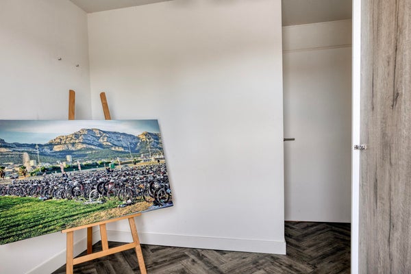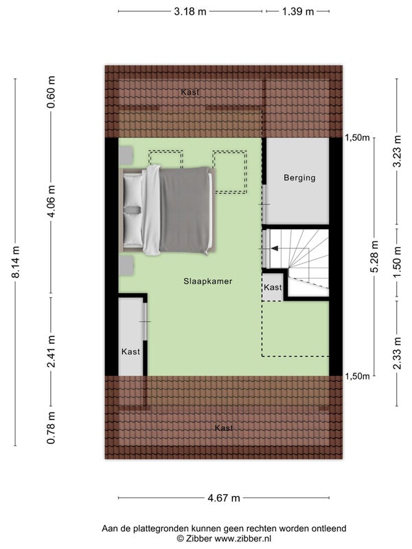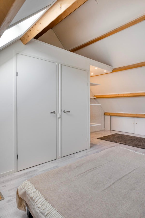 De slaapkamer beschikt over twee afgesloten kasten, waarvan één dienstdoet als inloopkast met hang- en leggedeelte. De andere kast herbergt de cv-installatie en de aansluitingen voor de wasmachine.