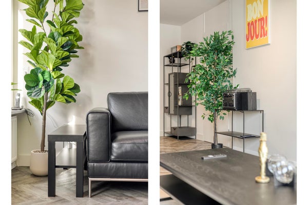 De woonkamer is compleet ingericht met een comfortabele lederen bank, flatscreen-tv en een ronde eettafel met vier stoelen. De sfeervolle aankleding met kunstplanten, schilderijen en decoratieve wandafwerking zorgt direct voor een huiselijk gevoel.