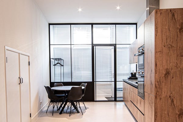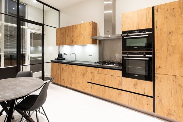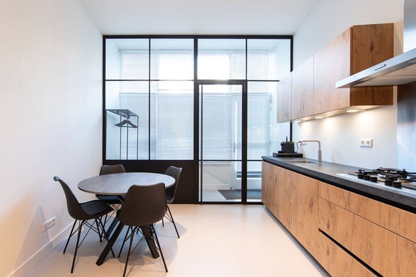 Bij binnenkomst treft u een ruime hal over de gehele breedte van het appartement, met voldoende ruimte voor een garderobe of fietsenstalling. De lichte leefruimte straalt rust en ruimte uit, mede door de fraaie zwart stalen tussenpui en het hoge plafond. Aan de voorzijde van het appartement is de moderne keuken (uit 2020) te vinden. Deze is voorzien van hoogwaardige inbouwapparatuur, waaronder een 5-pits gaskookplaat, Quooker, stoomoven/magnetron, heteluchtoven met grillfunctie, koel-/vriescombinatie en vaatwasser.