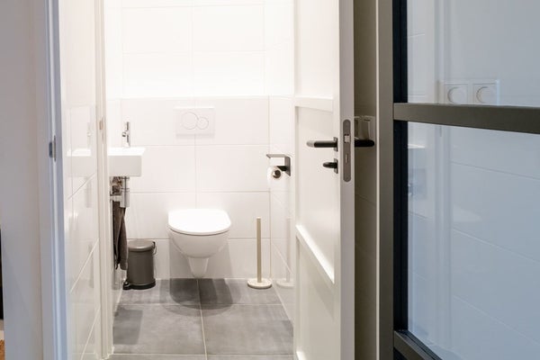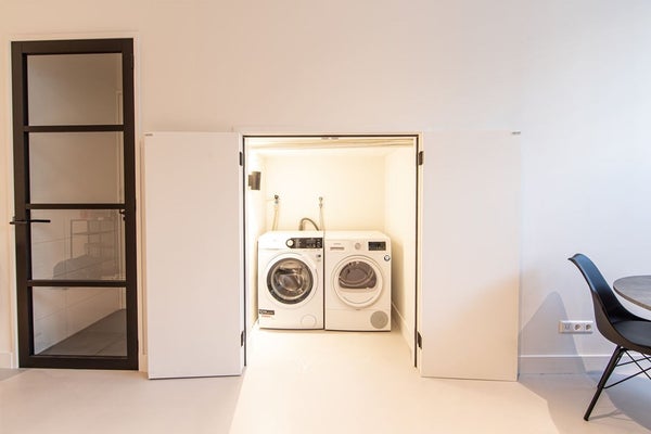 Aan de overkant van de keuken bevindt zich een praktische wasruimte met aansluitingen voor wasmachine en droger, evenals een keurige toiletruimte met wandcloset en fontein. De woonkamer, gelegen in het verlengde van de keuken, biedt voldoende ruimte voor een gezellige zithoek. De hele woning is afgewerkt met strak gestuukte wanden en een lichte gietvloer, voorzien van comfortabele vloerverwarming.