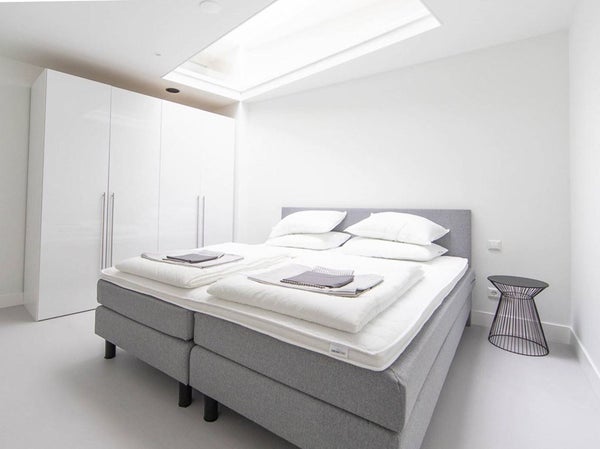 Aan de achterzijde van het appartement vindt u twee goed afgewerkte slaapkamers, beide met grote dakramen die veel natuurlijk licht binnenlaten. De luxe badkamer, eveneens voorzien van vloerverwarming, beschikt over een ligbad, inloopdouche, wastafelmeubel en een tweede toilet. Daarnaast is er een aparte stookruimte aanwezig.