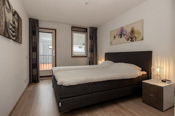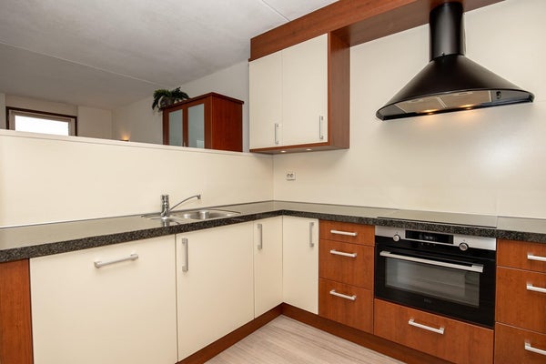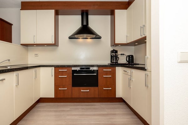 De moderne keuken in U-opstelling is uitgevoerd in noten en crème en beschikt over een granieten werkblad. Verder vindt u hier een combi-magnetron, een inductie kookplaat met schouwkap, 1 ½ spoelbak, vaatwasser en een koel/vriescombinatie. De 2 slaapkamers zijn beiden fris uitgevoerd en voorzien van een laminaatvloer. De grootste kamer heeft een Frans balkon op het westen, terwijl de kleinste slaapkamer kan dienst doen als logeerkamer of kantoor.