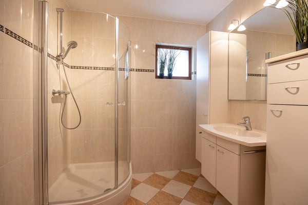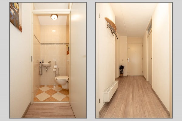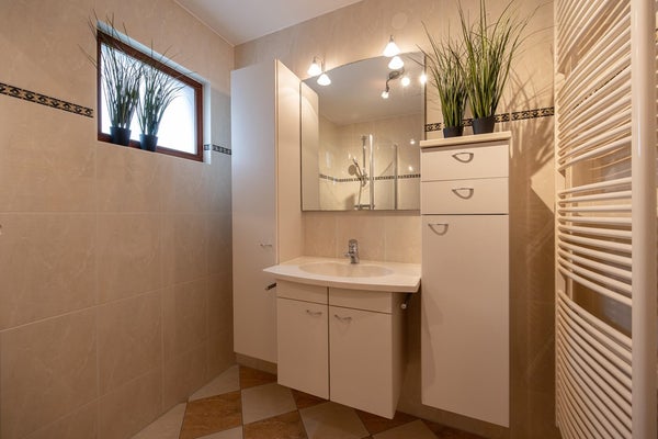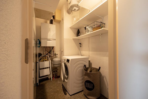 De moderne badkamer is volledig betegeld in een lichte kleurstelling en beschikt over een net badkamermeubel en een douchehoek met glazen douchedeuren. Verder vindt u in het appartement een bijkeuken, die plaats biedt aan de wasmachine en de CV-installatie en waar u spullen kunt opbergen.