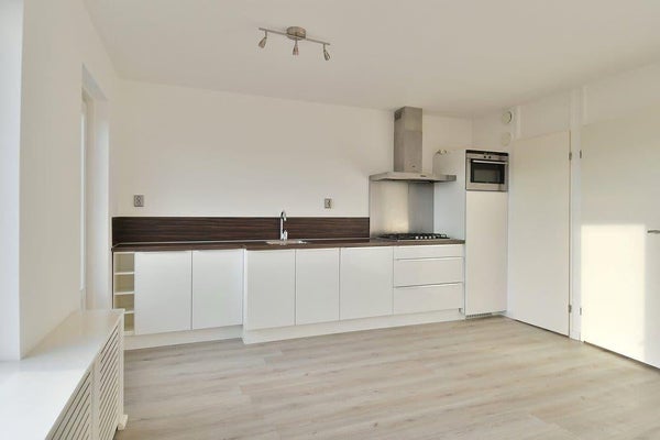 Tweede verdieping: entree, gang met toegang tot de verschillende ruimtes. Lichte woonkamer met open keuken voorzien van diverse inbouwapparatuur waaronder: afzuigkapoven-/magnetron, 4-pits gasfornuis, vaatwasser en koel-vriescombinatie, toegang tot balkon op het Zuid/Westen.