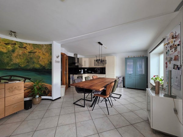 Links van de hal kom je gelijk binnen in de ruime eetkamer met open keuken in hoekopstelling, waar alle ruimte is om gezellig met vrienden te kunnen eten.