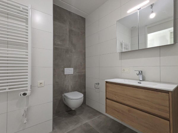 Badkamer met inloopdouche, wastafelmeubel en tweede toilet.