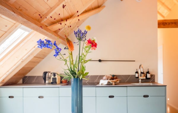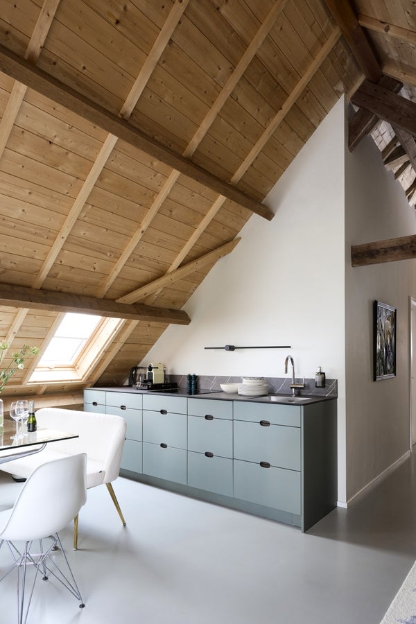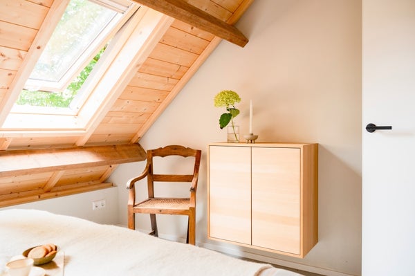 De Studio kenmerkt zich door een open en lichte sfeer. Het hoge plafond, de open dakconstructie en de zichtbare balken geven de ruimte een robuust en eigentijds loftgevoel, terwijl grote dakramen zorgen voor veel daglicht en een prettige ruimtelijke beleving. Het authentieke karakter van de voormalige schuur wordt hier harmonieus gecombineerd met hedendaagse luxe.