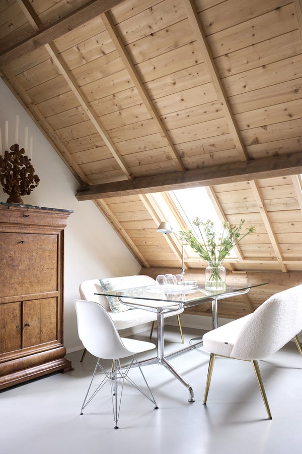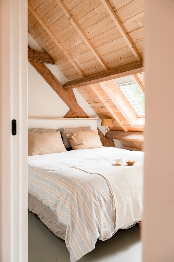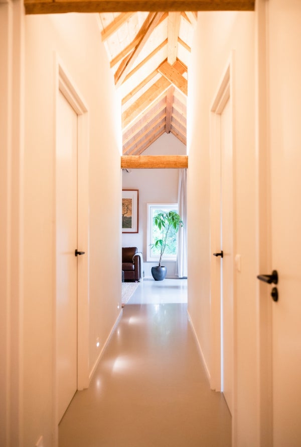 De Studio kenmerkt zich door een open en lichte sfeer. Het hoge plafond, de open dakconstructie en de zichtbare balken geven de ruimte een robuust en eigentijds loftgevoel, terwijl grote dakramen zorgen voor veel daglicht en een prettige ruimtelijke beleving. Het authentieke karakter van de voormalige schuur wordt hier harmonieus gecombineerd met hedendaagse luxe.