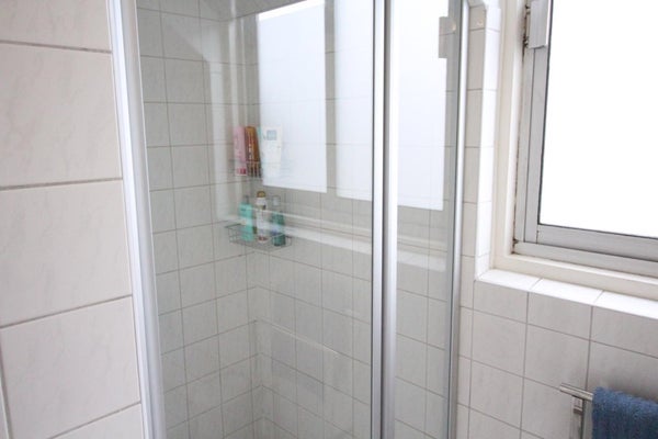 Badkamer met douchecabine, wastafel en toilet