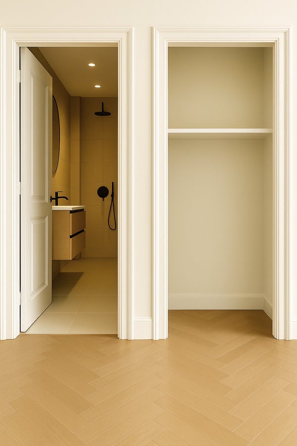 · Strakke wanden en een elegante visgraat PVC-vloer met vloerverwarming én -koeling