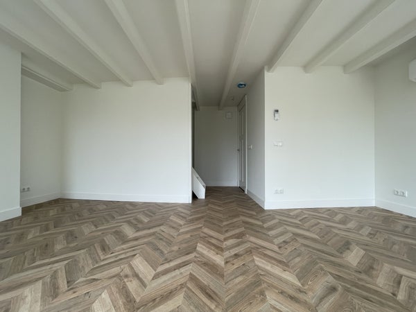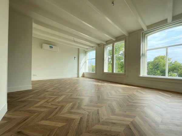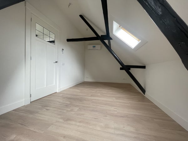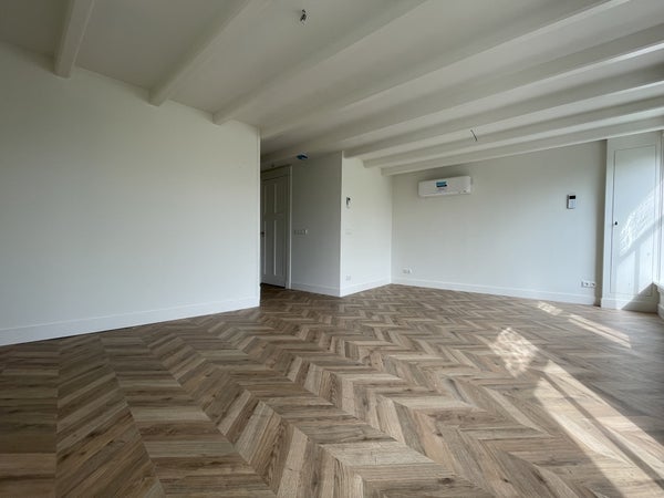 Royale woonkamer met prachtige vloer in Hongaarse punt, grote karakteristieke raampartijen en balkenplafond. De moderne open keuken is voorzien van een inductiekookplaat met afzuigkap, koelkast, diepvriezer, vaatwasser en combi-oven. In de woonkamer en slaapkamer hangt een airco-unit die zowel koelt als verwarmt, waardoor het in de zomer heerlijk koel is en in de winter aangenaam warm. De moderne badkamer is voorzien van regendouche, wastafel met spiegelkast en toilet.