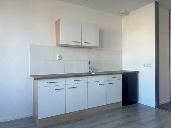 Het appartement beschikt over 1 slaapkamer van ca 10m2 en een ensuite badkamer van ca 2m2. De badkamer is voorzien van douche en wastafel en uitsluitend bereikbaar vanuit de slaapkamer. Het separate toilet is vanuit de hal bereikbaar en hier is tevens de aansluiting voor de wasmachine gesitueerd. Het appartement is voorzien van een laminaatvloer, grotendeels dubbele beglazing en rolluiken. Het nette keukenblok is voorzien van een koelkast.