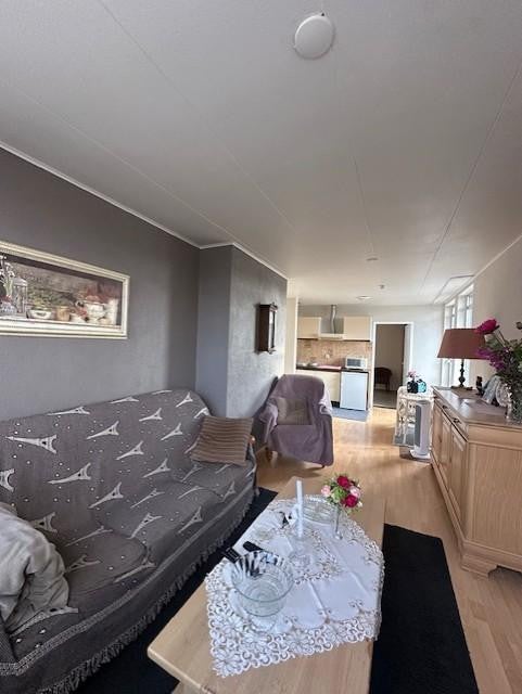Nette woonkamer met open keuken en aparte slaapkamer.