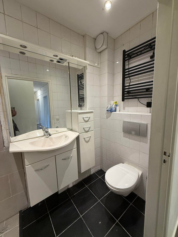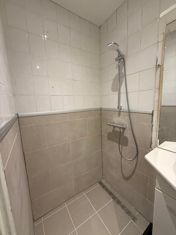 De badkamer met wc is volledig betegeld en heeft een afmeting van 3 m2.
