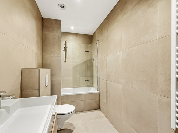De badkamer is recent volledig vernieuwd en luxe afgewerkt met grote tegels, een modern wastafelmeubel, toilet, en een combinatie van ligbad en inloopdouche.