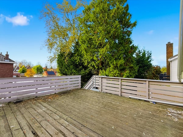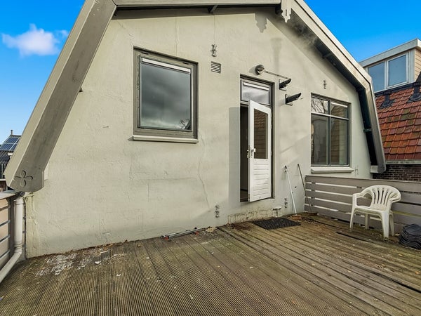 Vanuit de woonkamer heb je toegang tot het ruime dakterras — een heerlijke plek om te genieten van de zon en het groene uitzicht over de buurt.