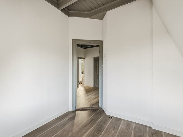 Via de entree bereik je de lichte woonkamer met fraaie vloer en hoge plafonds met zichtbare balken, wat de ruimte een karaktervolle en moderne uitstraling geeft. De grote raampartijen zorgen voor veel natuurlijk licht.