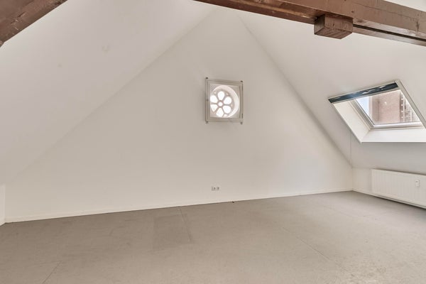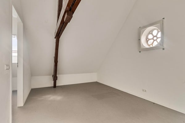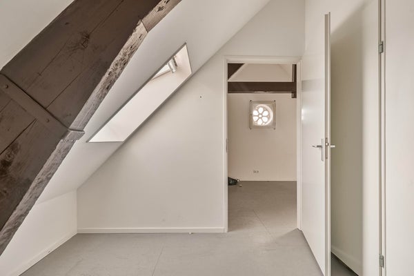 De sfeervolle slaapkamer is circa 20 m2. In de kamer zijn de authentieke balken en kozijnen bewaard gebleven, wat extra sfeer geeft aan de slaapkamer.
