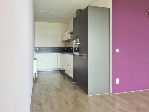 Appartement: Entree/hal, meterkast, garderobe, riante slaapkamer, badkamer met een inloopdouche, wastafelmeubel, toilet. Separate opstelplaats voor wasmachine en droger. Lichte woonkamer met balkon over de volle breedte gelegen op het zuidwesten. Half open keuken voorzien van gasfornuis, oven, afzuigkap, vaatwasser en losse koelkast.