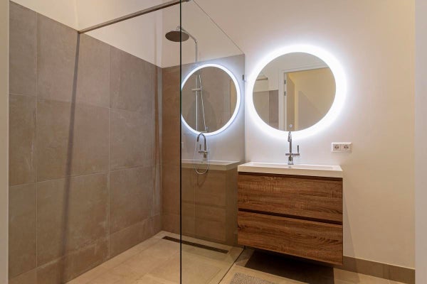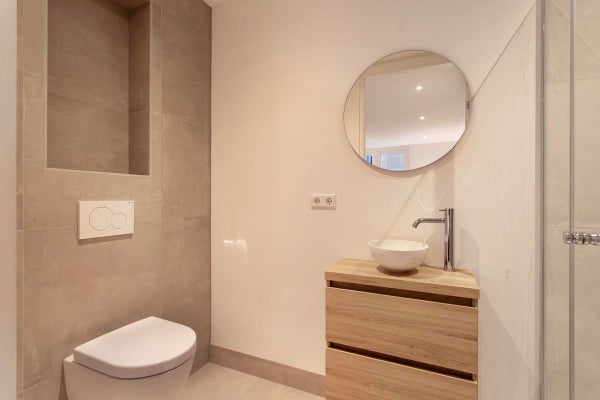 Via de hal bereik je de kantoorruimte/kinderkamer welke toegang geeft tot de patio. Ook zijn de badkamer en slaapkamers te bereiken via de hal. De badkamer is voorzien van een toilet, inloopdouche en wastafel met wastafelmeubel. Via de trap bereik je de eerste slaapkamer in het souterrain. Deze slaapkamer heeft een eigen badkamer. Deze is tevens voorzien van een toilet, inloopdouche en wastafel met wastafelmeubel. Daarboven bevindt zich de tweede slaapkamer.