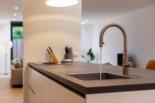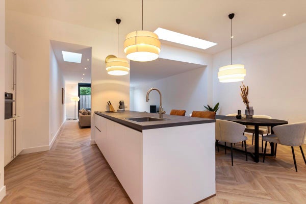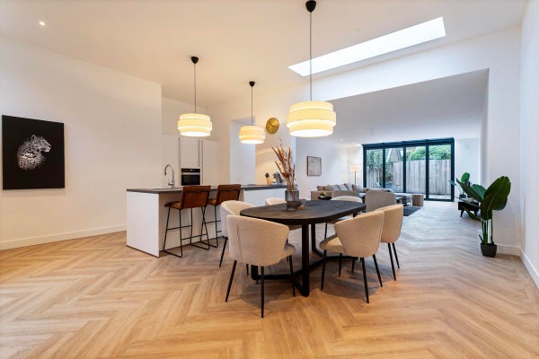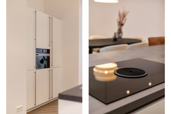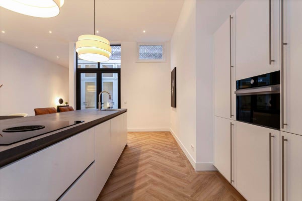 Entree via de glazen draaideur (geblindeerd), ruime hal toegang tot de zeer ruime woonkamer met moderne open keuken. De woonkamer is o.a. voorzien van een hoekbank, fauteuils, salontafel, tv-meubel met tv. Via de openslaande deuren bereik je de achtertuin op het zuiden. Tevens is in de woonkamer een eettafel aanwezig voor zes personen. Deze bevindt zich naast het kookeiland. Het kookeiland is voorzien van een bargedeelte, Quooker voor direct kokend water, Bora inductiekookplaat met interne afzuiging, een vaatwasser en kastruimte. De keuken is verder o.a. voorzien van een oven, koelkast en vriezer.