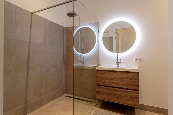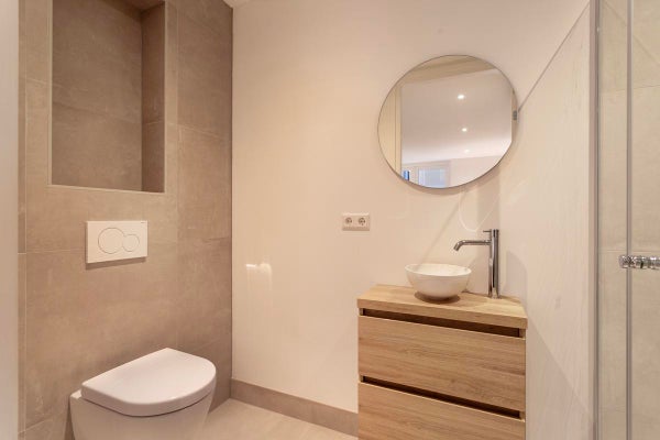Via de hal bereik je de kantoorruimte/kinderkamer welke toegang geeft tot de patio. Ook zijn de badkamer en slaapkamers te bereiken via de hal. De badkamer is voorzien van een toilet, inloopdouche en wastafel met wastafelmeubel. Via de trap bereik je de eerste slaapkamer in het souterrain. Deze slaapkamer heeft een eigen badkamer. Deze is tevens voorzien van een toilet, inloopdouche en wastafel met wastafelmeubel. Daarboven bevindt zich de tweede slaapkamer.