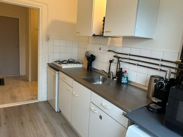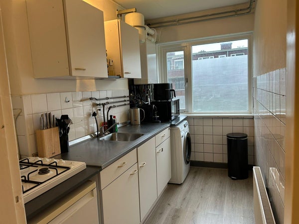 De keuken beschikt over een gaskookplaat, afzuigkap en genoeg kastruimte. Daarnaast is er ruimte voor een koelkast en wasmachine.
