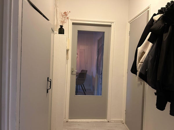 Het appartement is gelegen op de 2e verdieping van het complex. Je komt binnen in de hal die toegang biedt tot de woonkamer, de kleine slaapkamer, de keuken en een apart toilet. Tegenover het toilet zit een kleine opbergruimte.