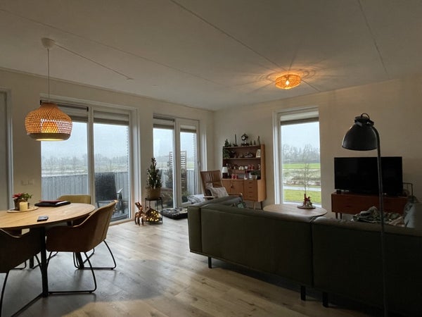 De grote woonkamer heeft een moderne open keuken voorzien van inductiekookplaat, wandafzuigkap, combimagnetron, koelkast met vriesvak en vaatwasser. Vanuit de woonkamer heb je toegang tot een groot balkon.
