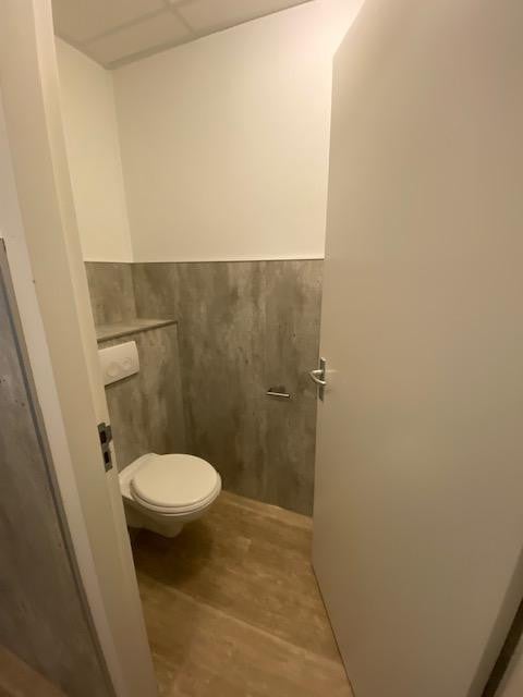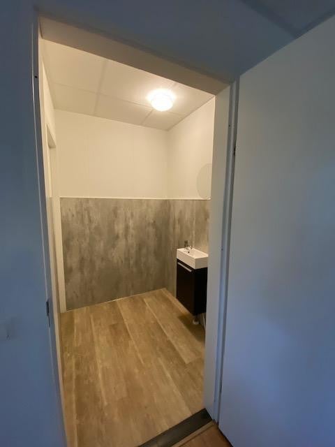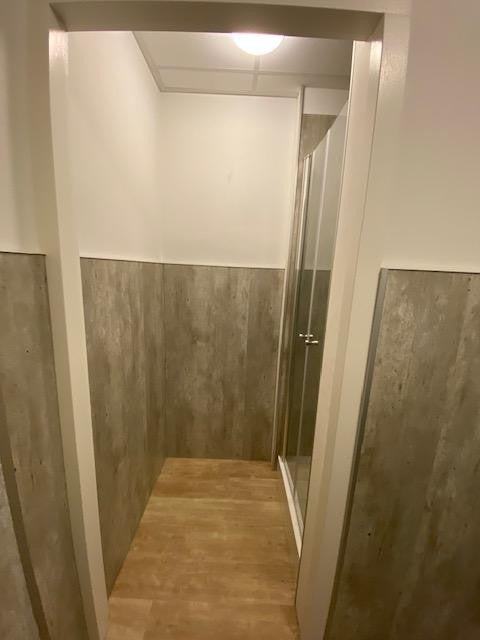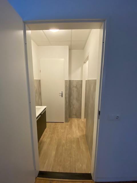 Vanuit de woonkamer heb je toegang tot de tweede slaapkamer, de badkamer en het toilet. De badkamer beschikt over een aparte douche, wastafel(meubel) en een aparte ruimte voor de wasmachine. De toiletruimte is zeer groot en met een fonteintje en hangend toilet.