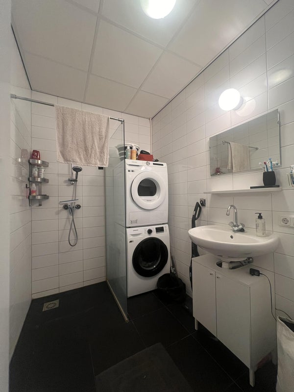 Bij binnenkomst is aan de rechterzijde een moderne keuken met alle benodigde apparatuur, zoals een inductie kookplaat, een combi oven/ magnetron, een koel-/vriescombinatie, een afzuigkap en een vaatwasser. Tegenover de keuken bevindt zich een nette badkamer met wc, wastafel, semi afgesloten douche en een aansluiting voor de wasmachine. De achterste helft van de studio is de leefruimte. Hier is ruimte voor een woonkamer en een semi afscheiding voor het slaapgedeelte. Het totale woonoppervlak is ca. 31 m2.