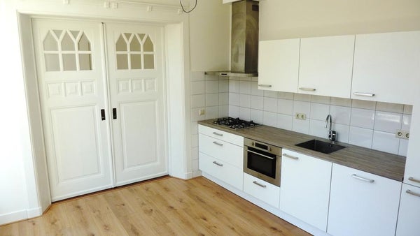Entree woning op de 1e etage: lichte woonkamer met fraaie sierschouw en bewerkt stucplafond. Schuifdeuren naar de ruime en gezellige woonkeuken met sierschouw en inbouwapparatuur.