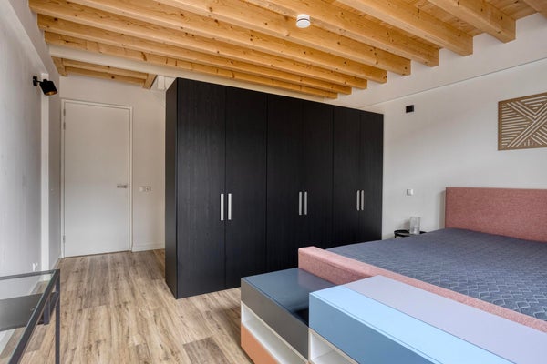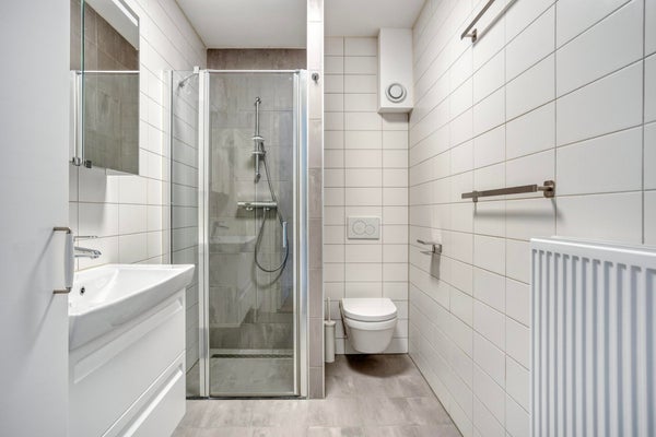 Via de vaste trap op de eerste verdieping bereik je de ruime slaapkamer en moderne badkamer. De badkamer is voorzien van een inloopdouche, toilet en een wastafelmeubel. Ook de wasmachine en droger zijn handig geïntegreerd.