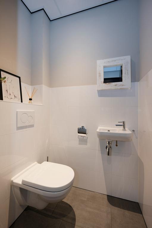 Het toilet heeft een hangcloset en wastafel en dezelfde keuze van materialen is hier toegepast als in de badkamer.