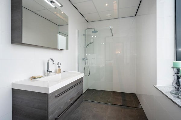 De badkamer is volledig stijlvol afgewerkt en straalt luxe uit, dit komt deels door de keuze van de gebruikte materialen. In de badkamer vind je een ruime douchehoek en een grote wastafel met meubelen.