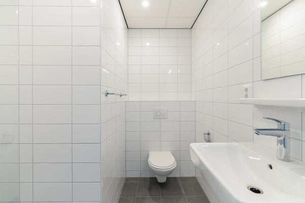 De badkamer heeft donkergrijze vloeren en witte wandtegels. De ruimte is voorzien van een inloopdouche, toilet en wastafel met spiegel.