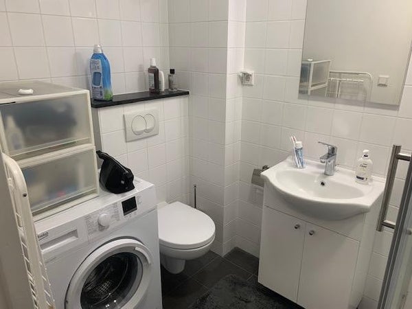 In het midden ligt de badkamer met douchecabine, handdoekenradiator, zwevend toilet, wasmachine en wastafel.