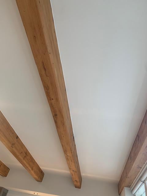 Aan de achterzijde is de ruime en lichte woonkamer met open keuken. De ruimte is hoog en heeft mooie originele houten balken. Via openslaande deuren komt u op het dakterras.